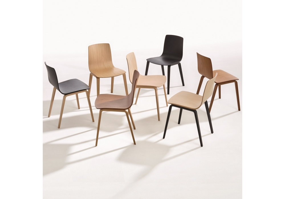 La colección Aava, diseñada por Antti Kotilainen para Arper, es un sistema de asientos. Asiento sobre estructura de cuatro patas en madera multiestrato de compensado curvado y chapeado, efecto abedul, natural o barnizada en cuatro colores. Carcasa y base se pueden ordenar con el mismo acabado, o combinar en acabados distintos.