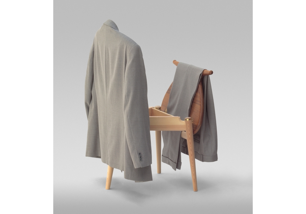 PP250 Valet Chair designed by Hans J. Wegner per PP Møbler is a wooden chair. The backrest works as a valet stand. The seat is hinged and can be placed in an upright position, underneath the seat a box is revealed for pocket emptier.