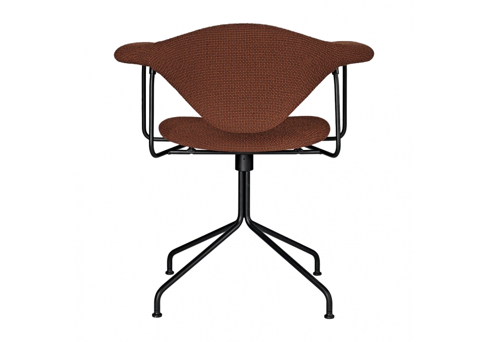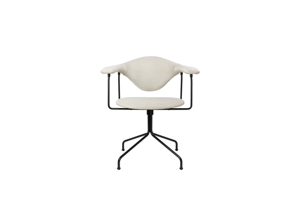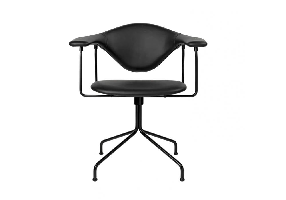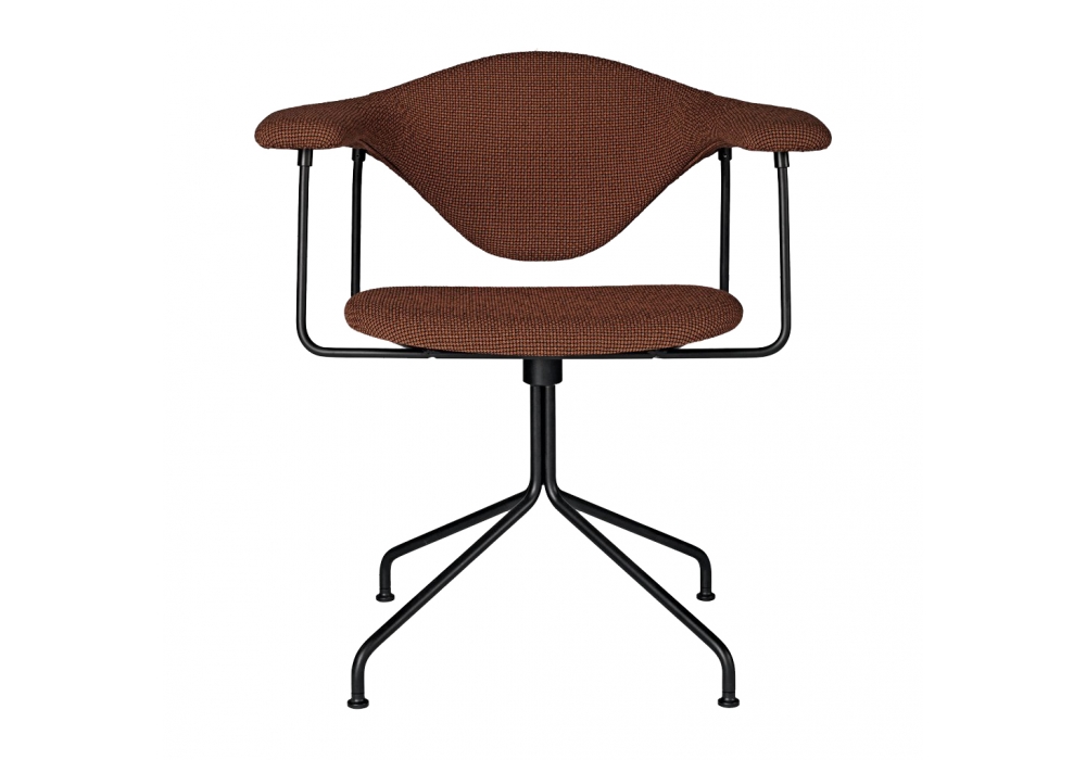 Masculo Meeting diseñada por GamFratesi para Gubi es una silla con base giratoria realizada con estructura de acero negro semimate y revestimiento en tela o piel.