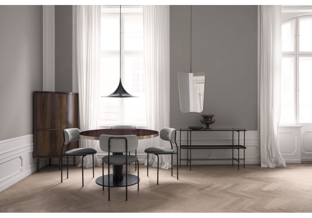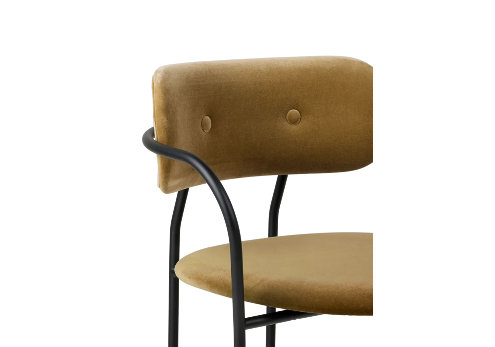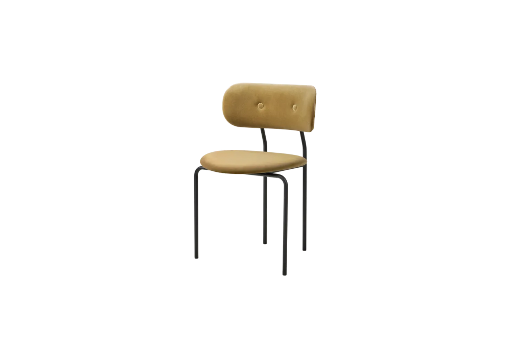 Coco diseñada por OEO Studio para Gubi es un silla con asiento y respaldo de contrachapado moldeado totalmente tapizado en tejido o piel y base negra. Disponible en diferentes acabados, con o sin reposabrazos.