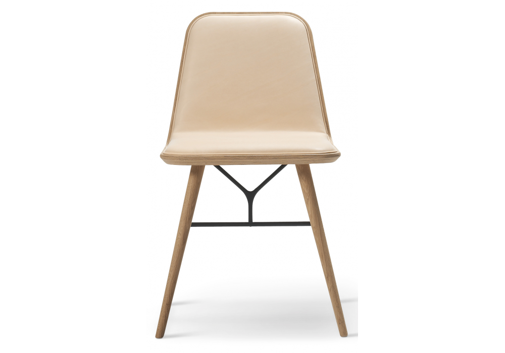 Spine diseñada por Space Copenhagen para Fredericia es una silla con estructura de madera maciza de roble o fresno con soporte de metal pintado en polvo. Carcasa del asiento en madera contrachapada con núcleo de haya. Parte delantera de la carcasa del asiento acolchada con espuma y revestida de tela o piel, rematada con ribetes.