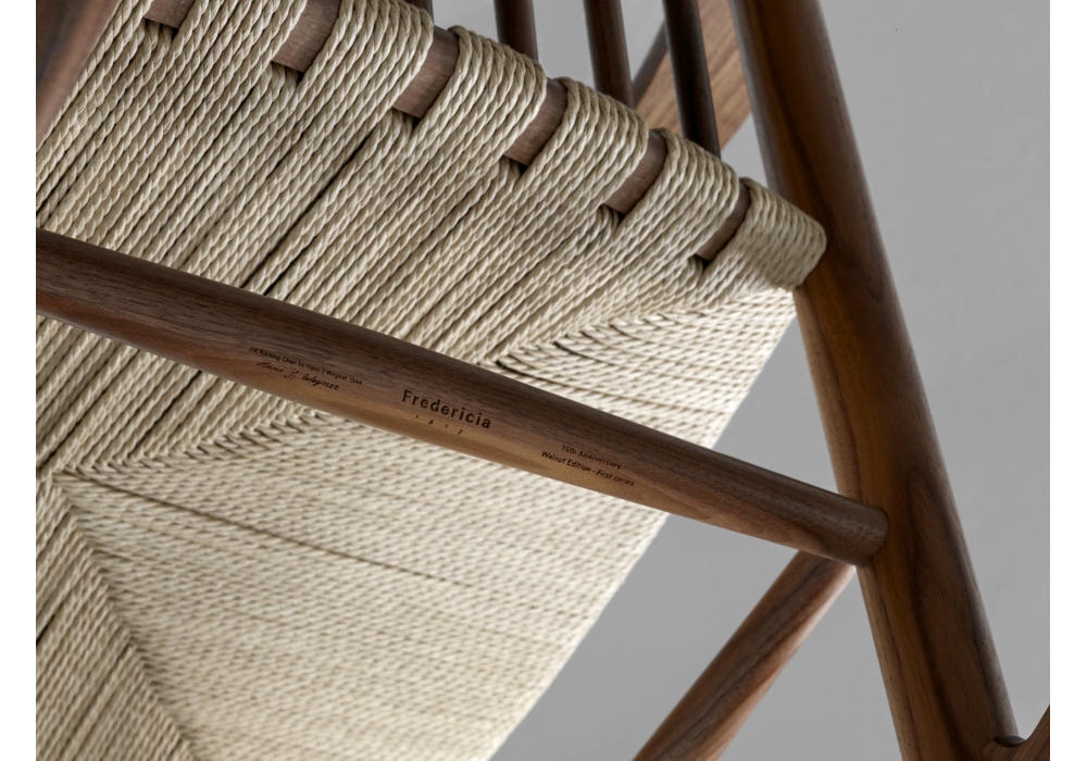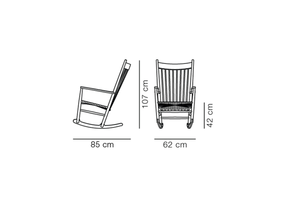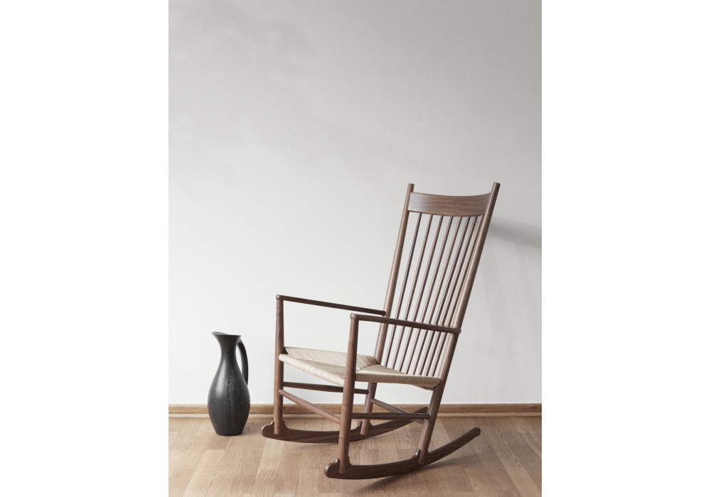Wegner J16 diseñada por Hans J. Wegner para Fredericia es una mecedora realizada en madera maciza de roble o nogal. Asiento de cuerda de papel tejido en acabado natural o negro.
