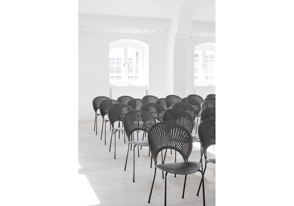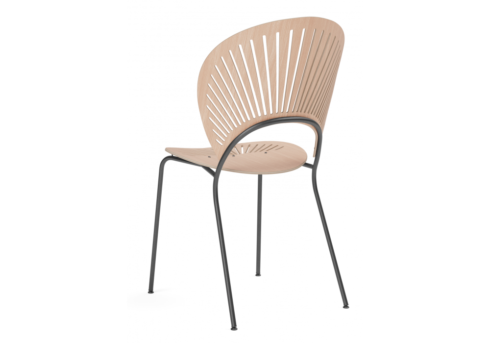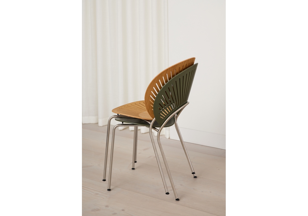 Trinidad diseñada por Nanna Ditzel para Fredericia es una silla con estructura en tubo de acero y respaldo en madera contrachapada modelada con cortes fresados en CNC. Asiento y respaldo montados con remaches. Disponible con o sin reposabrazos.