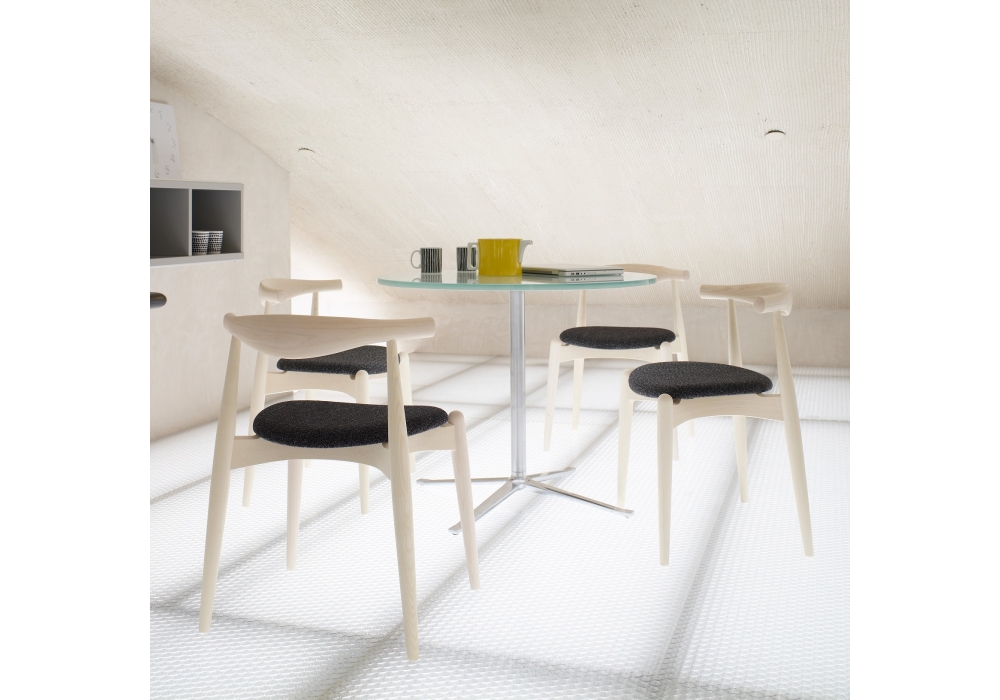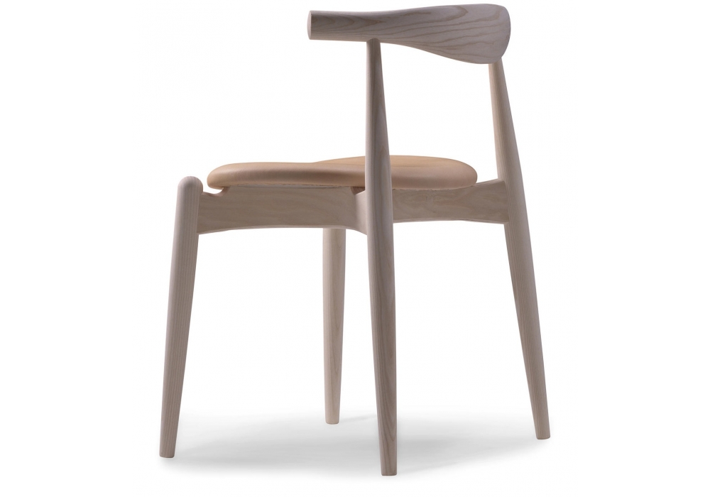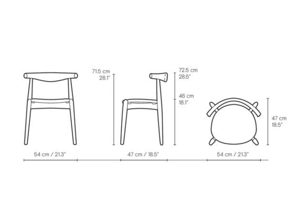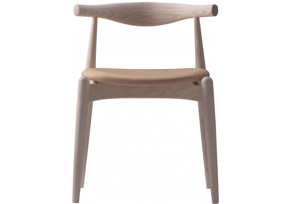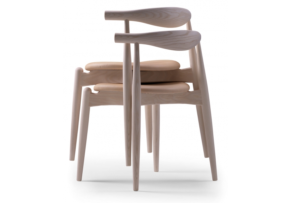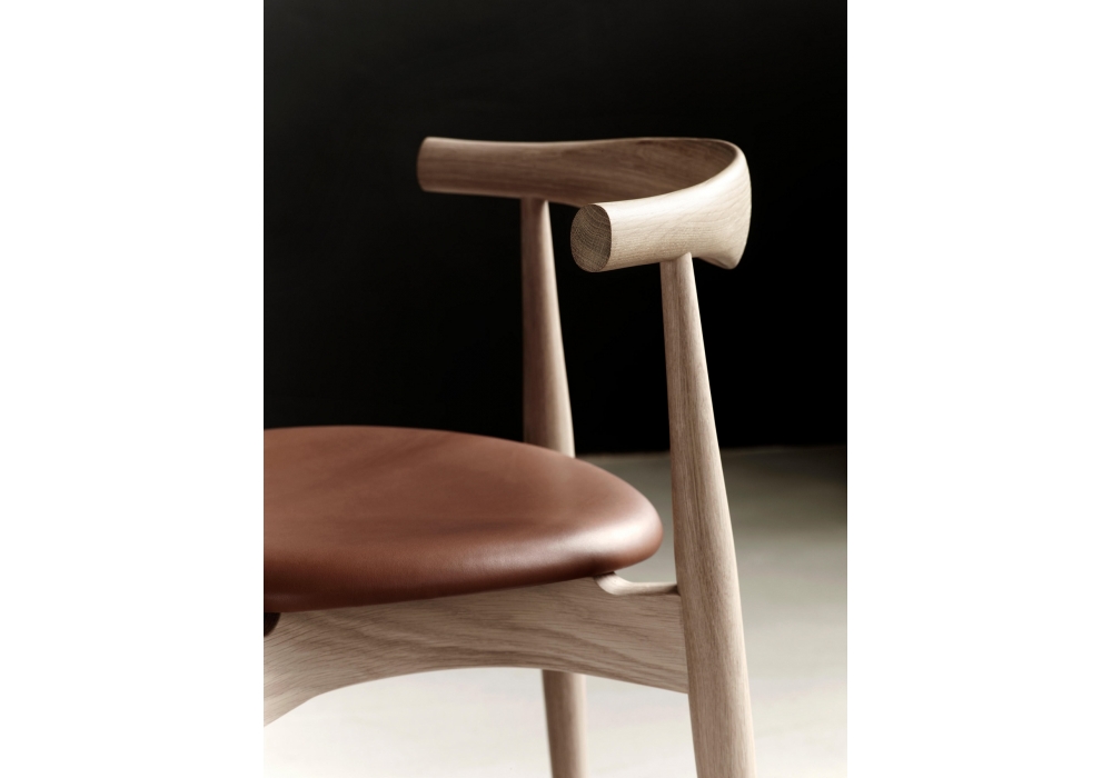 CH20 Elbow diseñada por Hans J. Wegner para Carl Hansen & Søn es una silla con estructura de madera maciza disponible en diferentes acabados. Asiento en espuma retardante de llama fría CMHR y revestimiento en tejido o cuero.