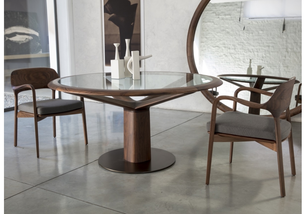 Ella diseñada por P. Jouin para Porada es una silla con brazos y estructura de nogal canaletta macizo. Asiento de nogal canaletta maciazo con relleno en goma de densidad diferenciada con soporte interno de contrachapado revestido en tela o cuero. Con pies de nylon.