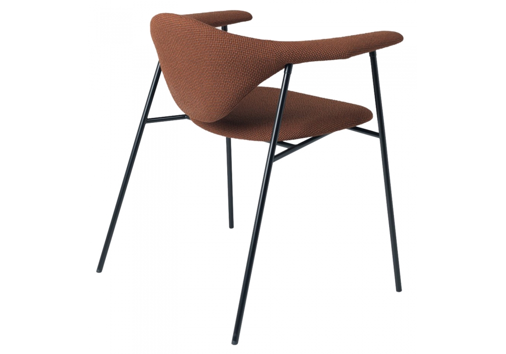 Masculo diseñada por GamFratesi para Gubi es una silla con base en acero pintado en polvo negro. Revestimiento disponible en tela o cuero.