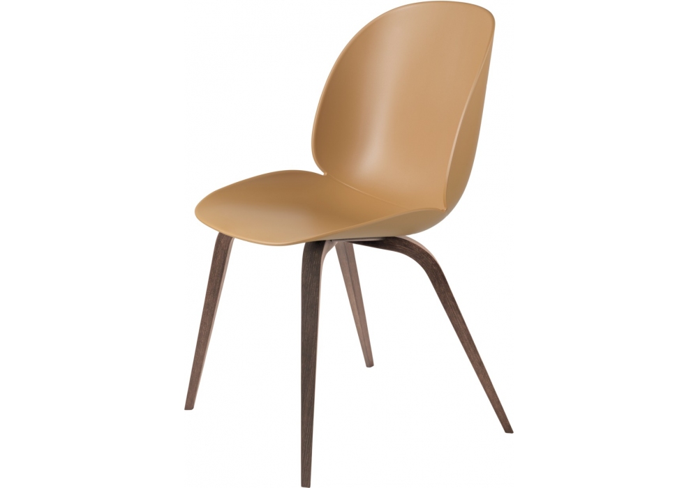Beetle Dining diseñada por GamFratesi para Gubi es una silla con base de madera y carcasa de polipropileno disponible en diferentes acabados.