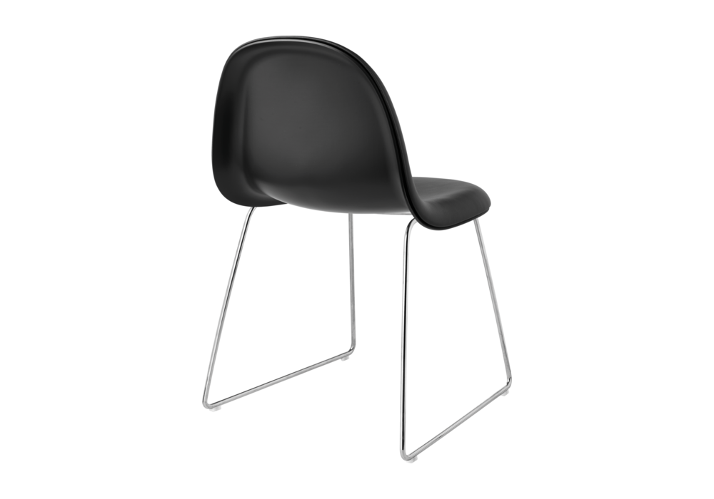 3D diseñada por Komplot Design para Gubi es una silla con base patín. Carcasa de madera y base negra o cromada. Tapizado en tela o piel.
