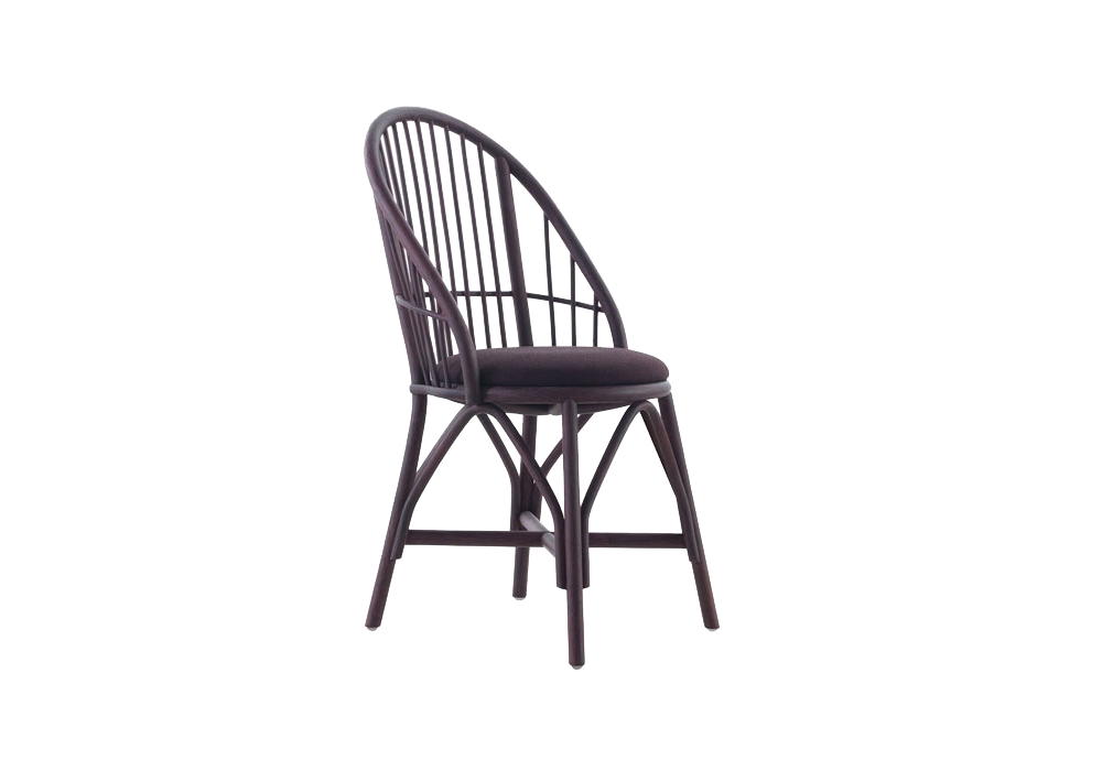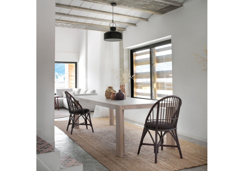 Coqueta diseñada por Studio Expormim es una silla de comedor hecha de rattan con asiento tapizado en tejido o piel. Disponible en diferentes acabados.