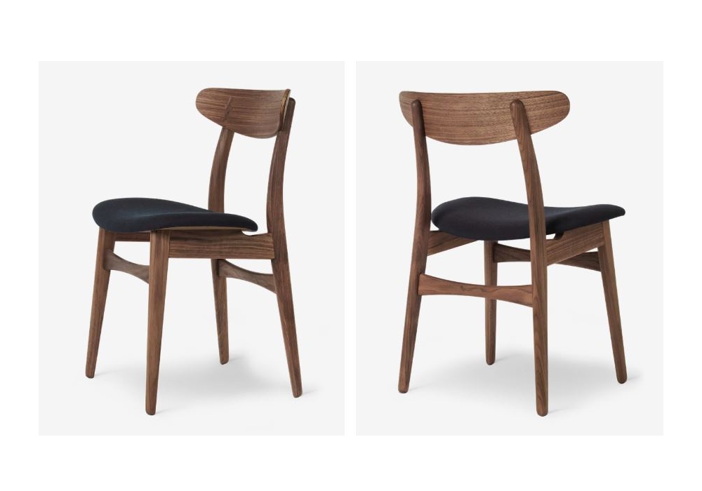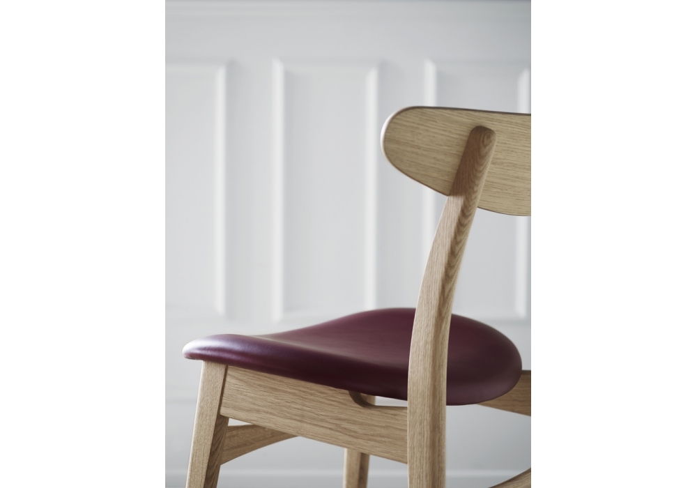 CH30P diseñada por Hans J. Wegner para Carl Hansen & Søn es una silla con estructura de madera maciza disponible en diferentes acabados. Asiento de espuma con tapicería de tela o cuero. Roble/nogal es una versión combinada, con estructura en roble y respaldo en nogal. El respaldo está decorado con incrustaciones en el mismo acabado que la estructura. En la versión roble/nogal la incrustación es de color roble.