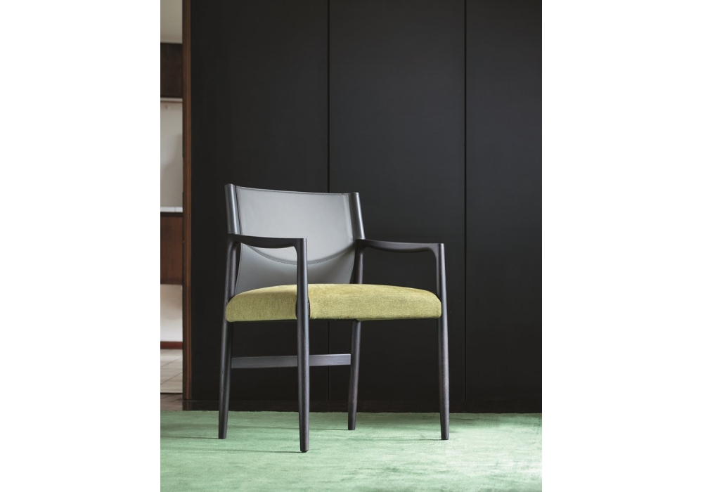 Sveva diseñada por G. & O. Buratti para Porada es una silla con respaldo en Cuoietto. Estructura en madera de fresno maciza disponible en los siguientes acabados: natural, teñido o lacado mate a poro abierto. Revestimiento en piel o tejido. Propuesta en la versión con o sin reposabrazos.