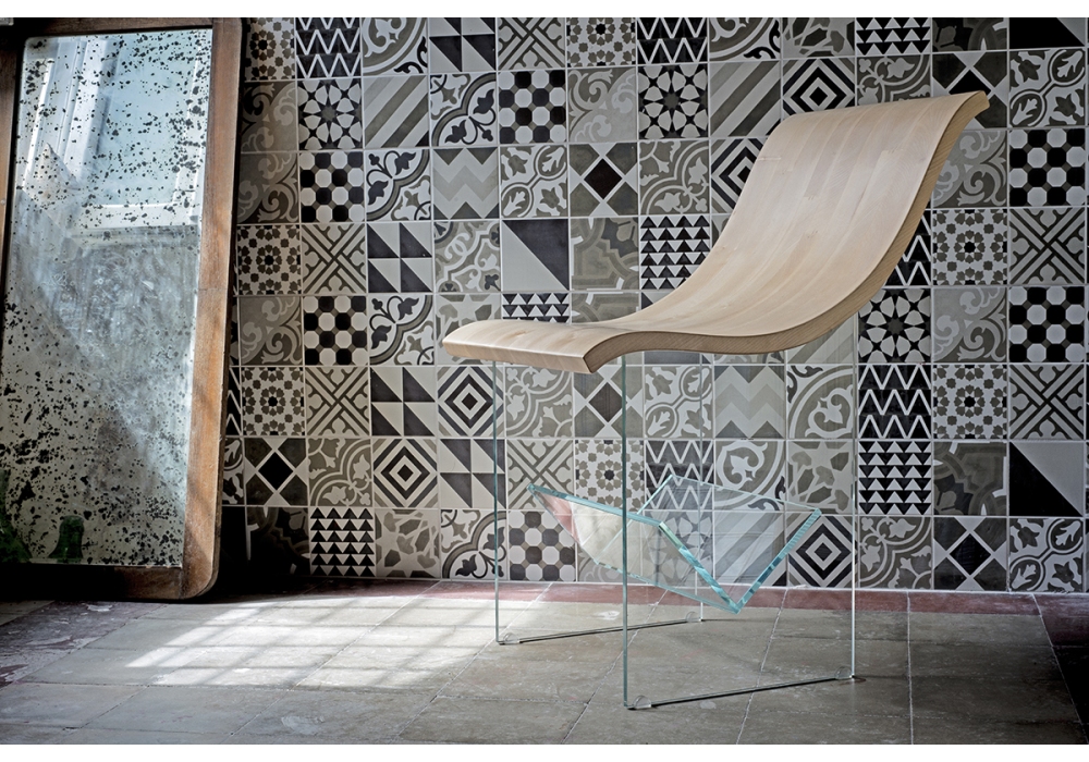 Synnefo por Salvatore Longo para Ornythos, es una silla con una carcasa de madera de arce y una base de vidrio templado.