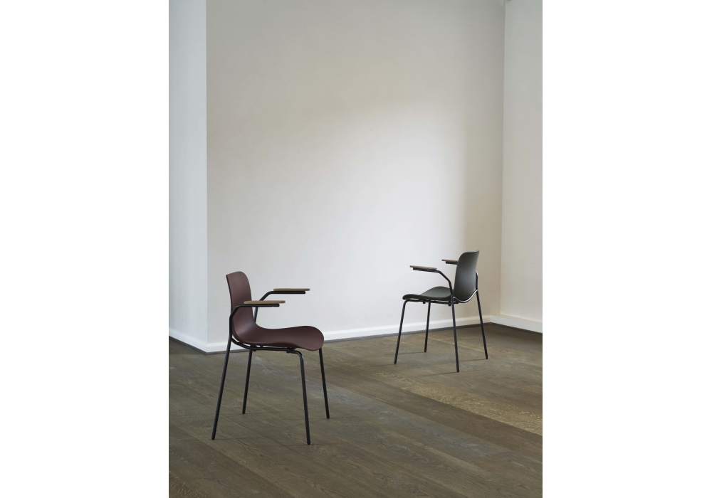 Langue Stack diseñada por Rune Krøjgaard y Knut Benedik Humlevik para Norr11 es una silla con reposabrazos. La base es de aluminio con recubrimiento de polvo negro y la carcasa de polipropileno en diferentes acabados.