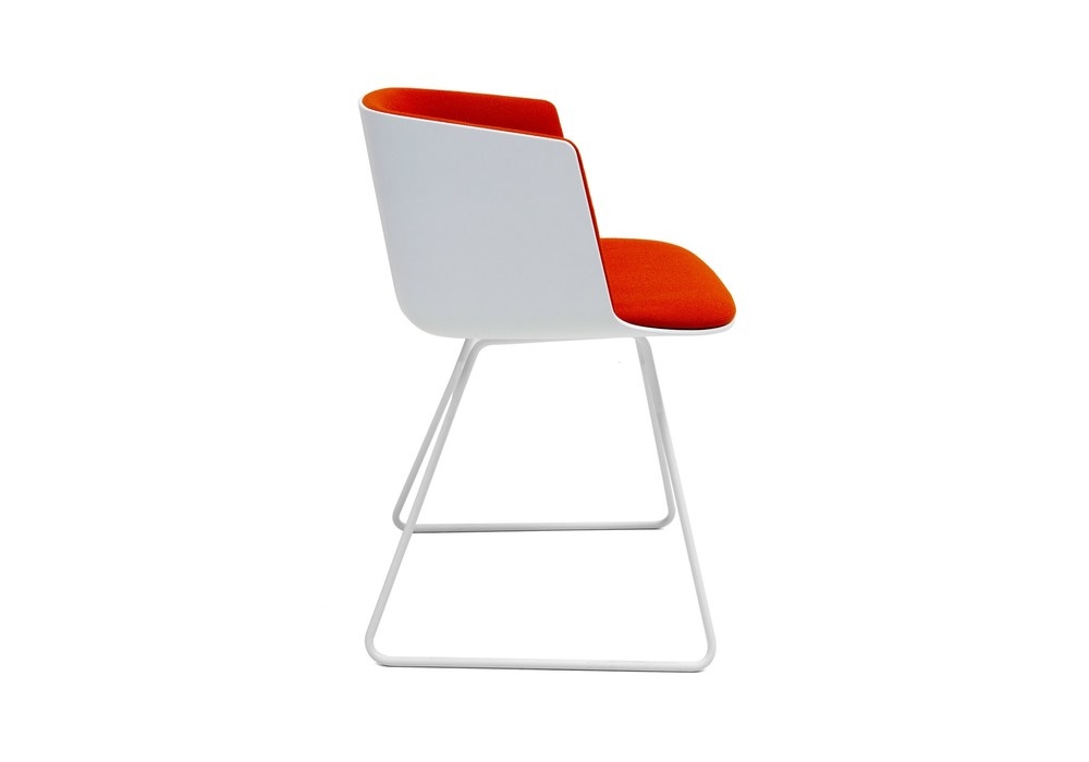 Cut diseñado por Francesco Rota para Lapalma es una silla con patín en tres acabados. Disponible con carcasa de poliuretano rígido blanco o negro y cubierta interna de tela o cuero.