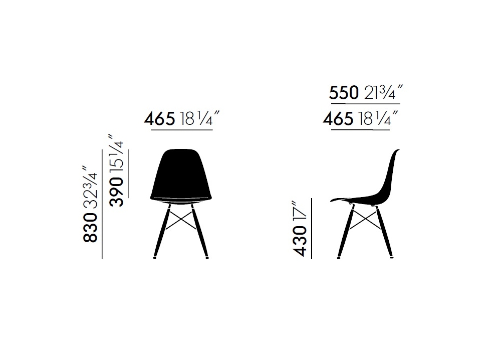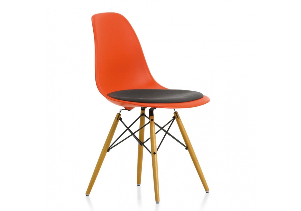Eames Plastic Side Chair DSW diseñada por Charles y Ray Eames para Vitra es una silla con cojín de la colección DSW con carcasa de polipropileno disponible en diferentes acabados y cojín de tela. Base reforzada en madera de arce o fresno y alambres de metal.