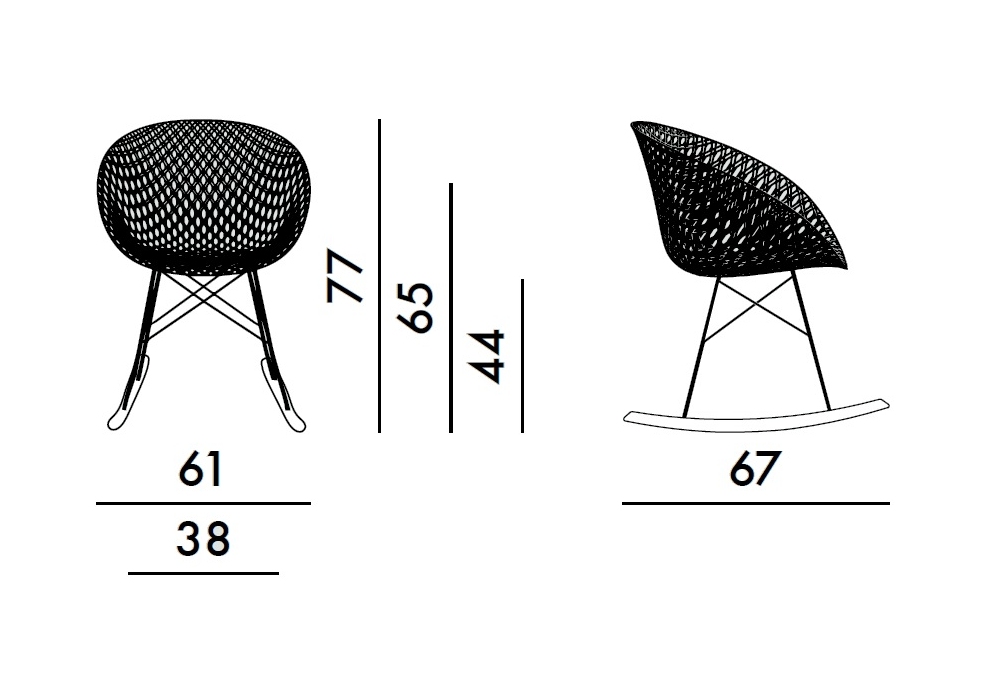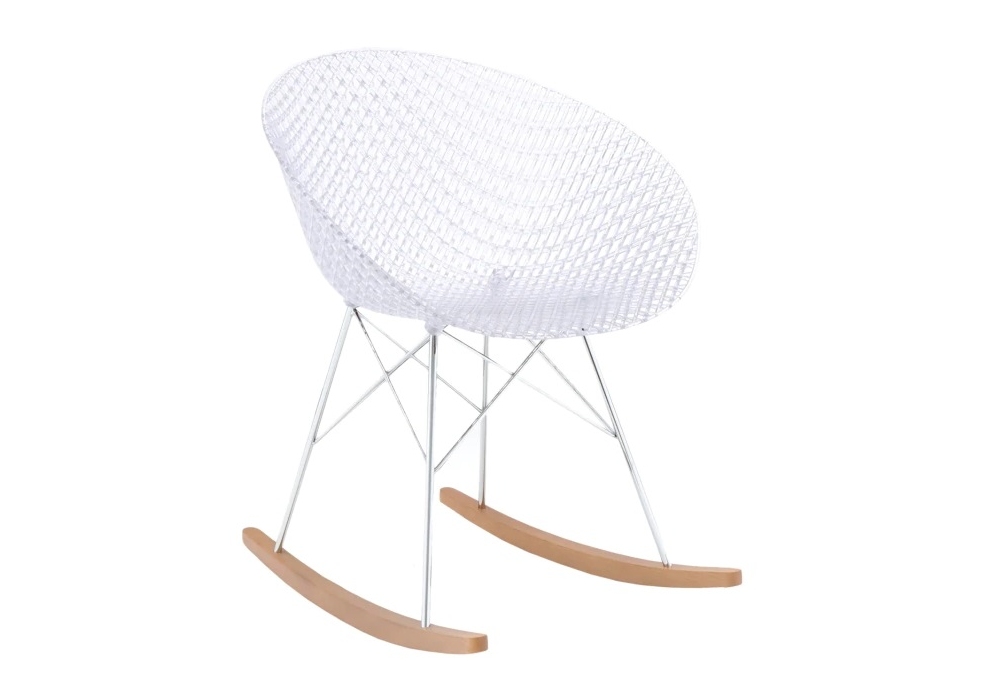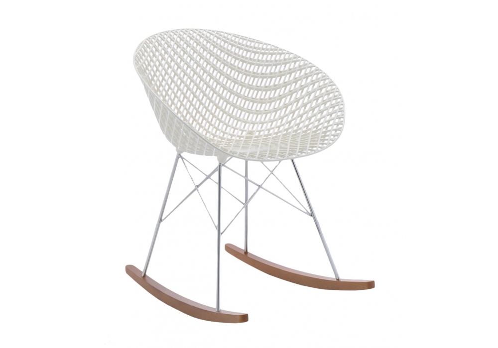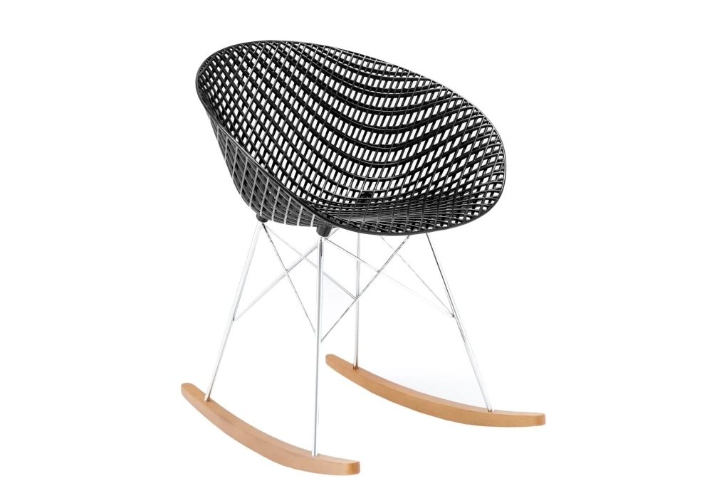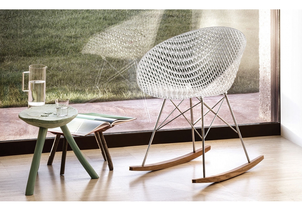 Smatrik diseñada por Tokujin Yoshioka para Kartell es una mecedora con carcasa de policarbonato 2.0 en diferentes acabados y estructura en acero cromado y balancín en madera teñida roble.