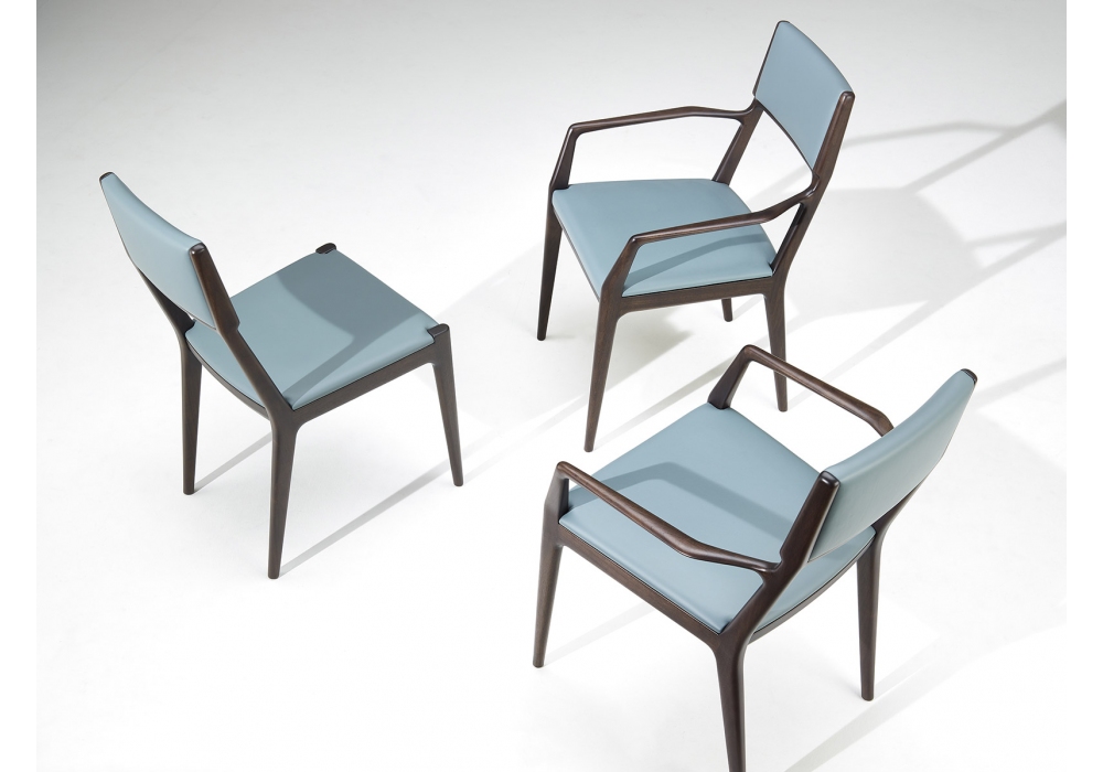 Ala diseñada por Giuseppe Casarosa para Ceccotti Collezioni es una silla realizada en nogal americano macizo o fresno. Asiento y respaldo en contrachapado de chopo tapizado. Disponible en diferentes acabados de cubierta.