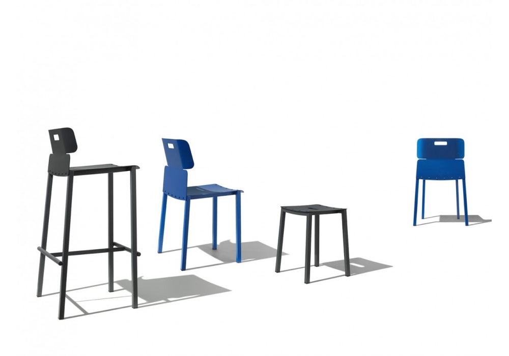 Meta diseñada por Giulio Iacchetti para InternoItaliano es una silla apilable de aluminio pintado con polvo epoxídico, para uso interior y exterior, totalmente hecha a mano y refinada con clavos y remaches de metal. Basada en el proceso de fabricación de la carrocería de los coches de carreras en el pasado.