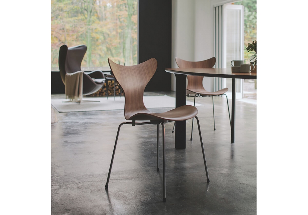 Lily diseñada por Arne Jacobsen para Fritz Hansen es una silla realizada con respaldo y asiento en chapa de madera color nogal natural y base cromada.