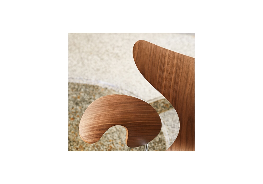 Lily diseñada por Arne Jacobsen para Fritz Hansen es una silla con reposabrazos realizada con respaldo y asiento en chapa de madera natural de color nogal y base cromada.