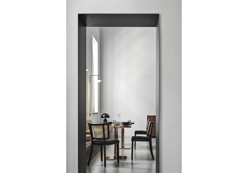 Sölden diseñada por Gebrüder Thonet Vienna es una silla en madera de haya curvada. Asiento tapizado y respaldo de caña tejida. También disponible con estructura en nogal Canaletto.