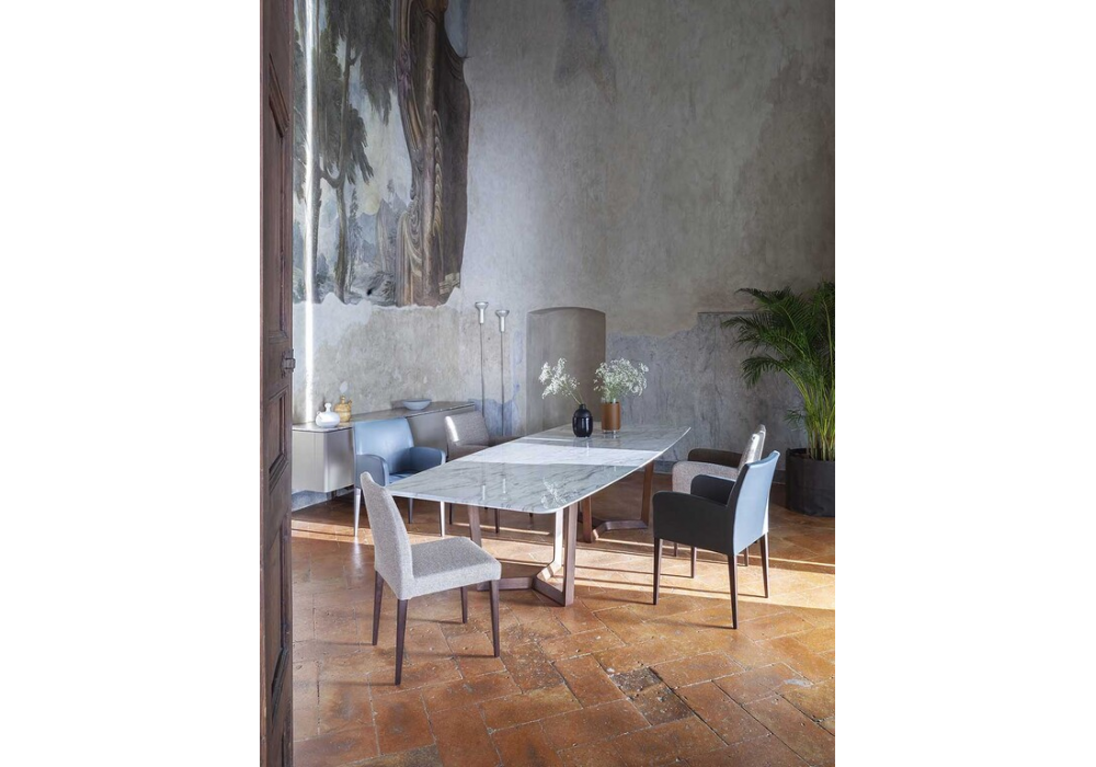 Liz diseñada por Poltrona Frau es una silla con patas de madera maciza de fresno y tapizada en tela o piel.