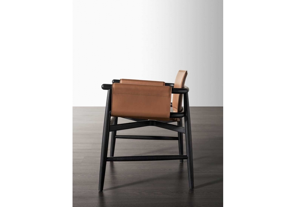 Teresina Kuoio diseñada por Andrea Parisio para Meridiani es una silla con estructura en roble macizo teñido. Asiento y respaldo revestidos en cuero. Patas negras en plástica. Disponible con bolsa integrada en cuero a la derecha, izquierda o ambos lados.