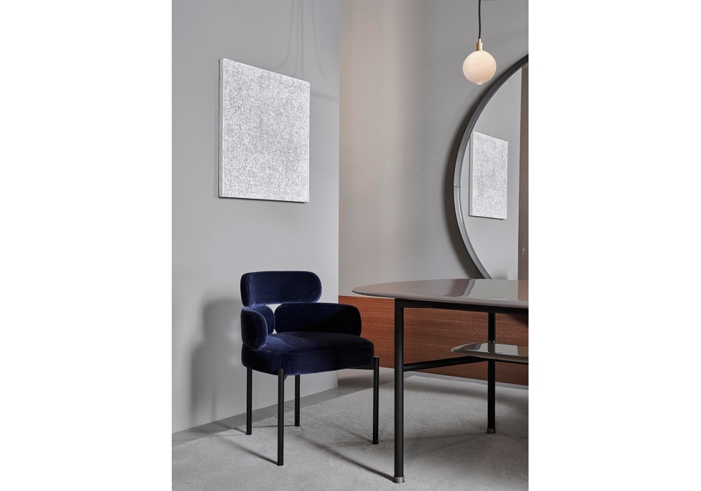 Sylvie diseñada por Andrea Parisio para Meridiani es una silla con estructura tubular en metal barnizado black mate. Estructura respaldo en tres piezas moldeadas de madera multilaminada. Estructura asiendo de madera multilaminada. Rellenos en poliuretano con densidad diferenciada y fibras de poliéster
