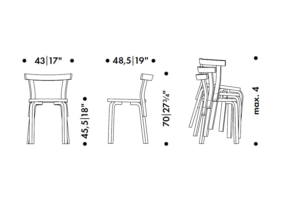 Chair 68 diseñada por Alvar Aalto para Artek es una silla realizada con patas, borde de asiento y respaldo en abedul macizo. Disponible en diferentes acabados.