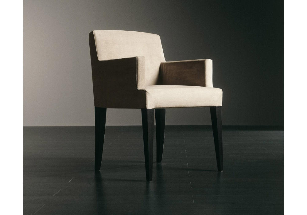 Cruz Tre diseñada por Andrea Parisio para Meridiani es una silla con brazos. Estructura en poliuretano moldeado con inserto enmetal; respaldo flexible. Patas en roble teñido. Revestimiento disponible en tela o piel.