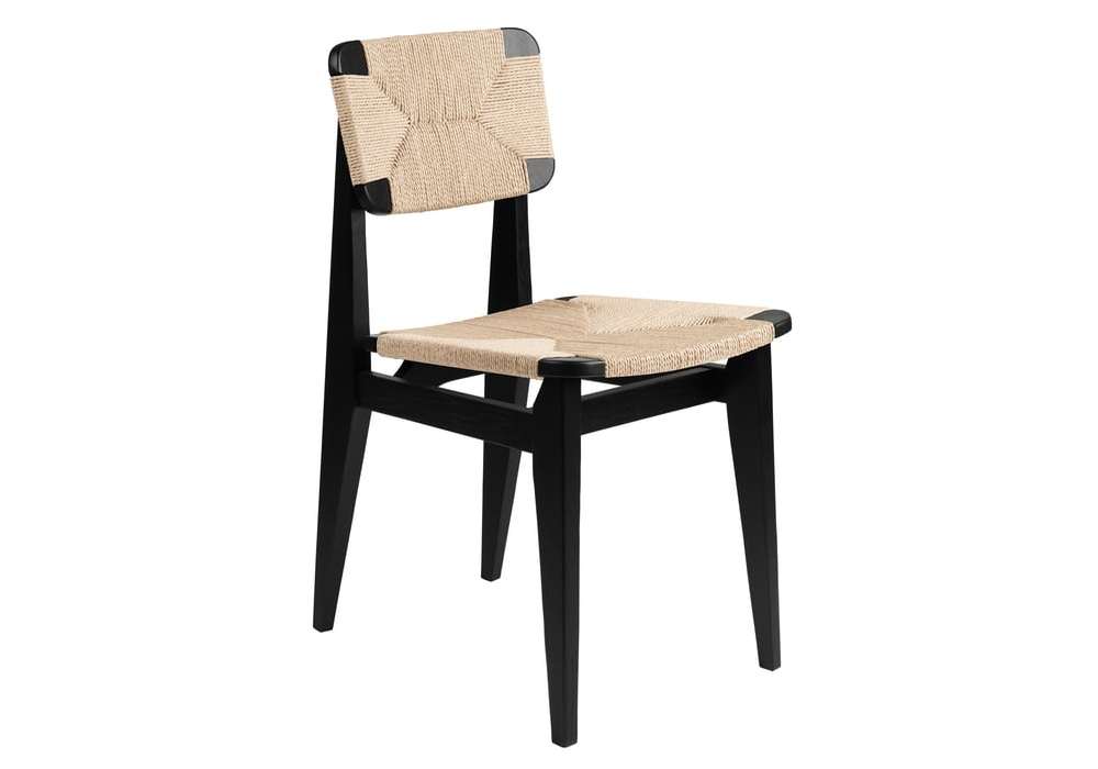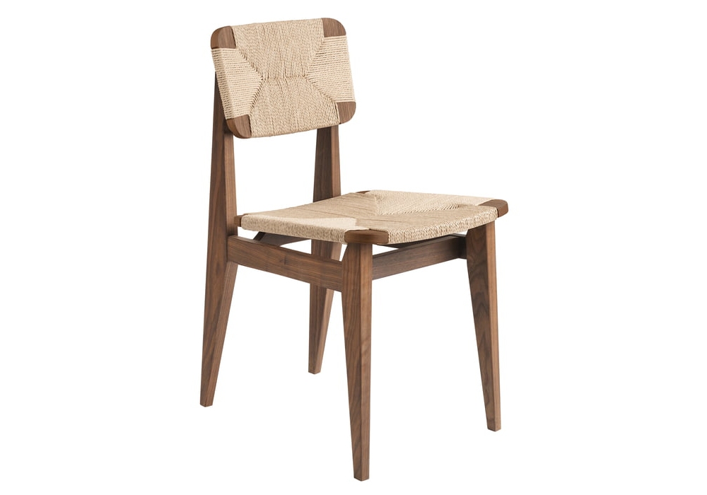 C-Chair diseñada por Marcel Gascoin para Gubi es una silla de comedor compuesta por una estructura de madera y un asiento y respaldo de madera revestidos con cuerda de papel tejido. Está disponible en diferentes acabados.