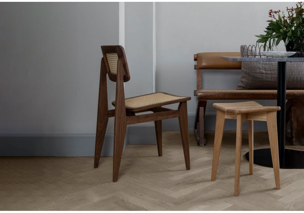 C-Chair diseñada por Marcel Gascoin para Gubi es una silla de comedor compuesta por una estructura de madera y asiento y respaldo en mimbre. Está disponible en diferentes acabados.