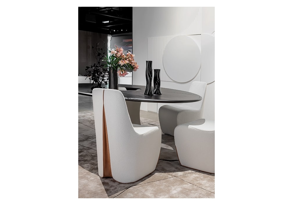 Tie diseñada por M2Atelier para Giorgetti es una silla con estructura en Polimex (material compuesto poliéster / poliuretano) y acolchado en espuma de poliuretano. La funda desenfundable de tela o piel está enriquecida con un ribete y una inserción de piel en la parte trasera. Pies de PVC. Se proporciona un kit de pies de fieltro.