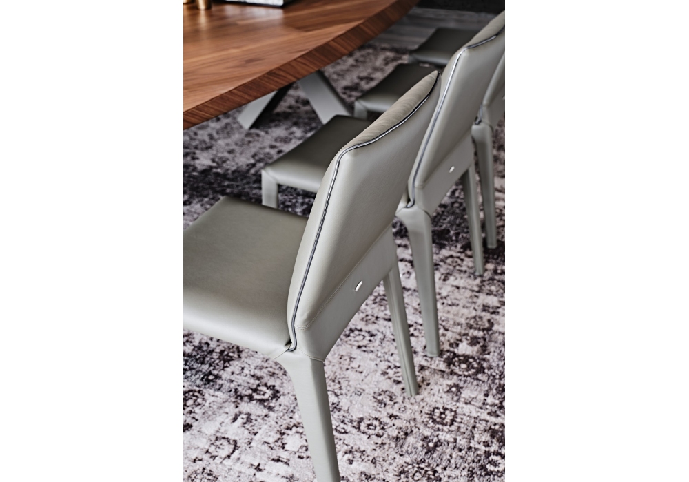 Penelope diseñada por Paolo Cattelan para Cattelan Italia es una silla sin reposabrazos y estructura en metal. Decoración del respaldo con detalle de color gris obscuro con efecto metálico. Revestimiento en tejido, ecopiel, synthetic nubuck, micro nubuck o piel.