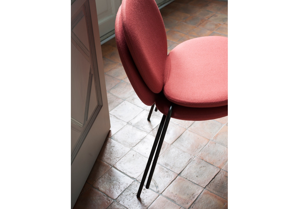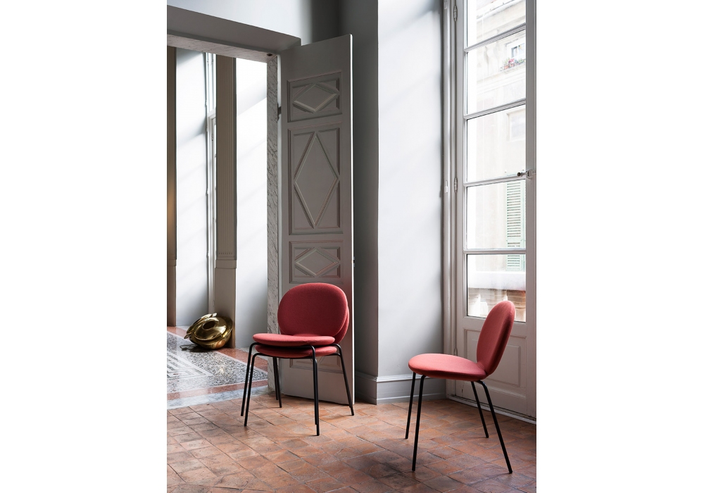 Kelly C Basic diseñada por Claesson Koivisto Rune para Tacchini es una silla con estructura interna de espuma en frío con inserciones de metal. La base es de tubo metálico, con recubrimiento de polvo o cromado en diferentes acabados. La silla es apilable hasta 4 piezas.