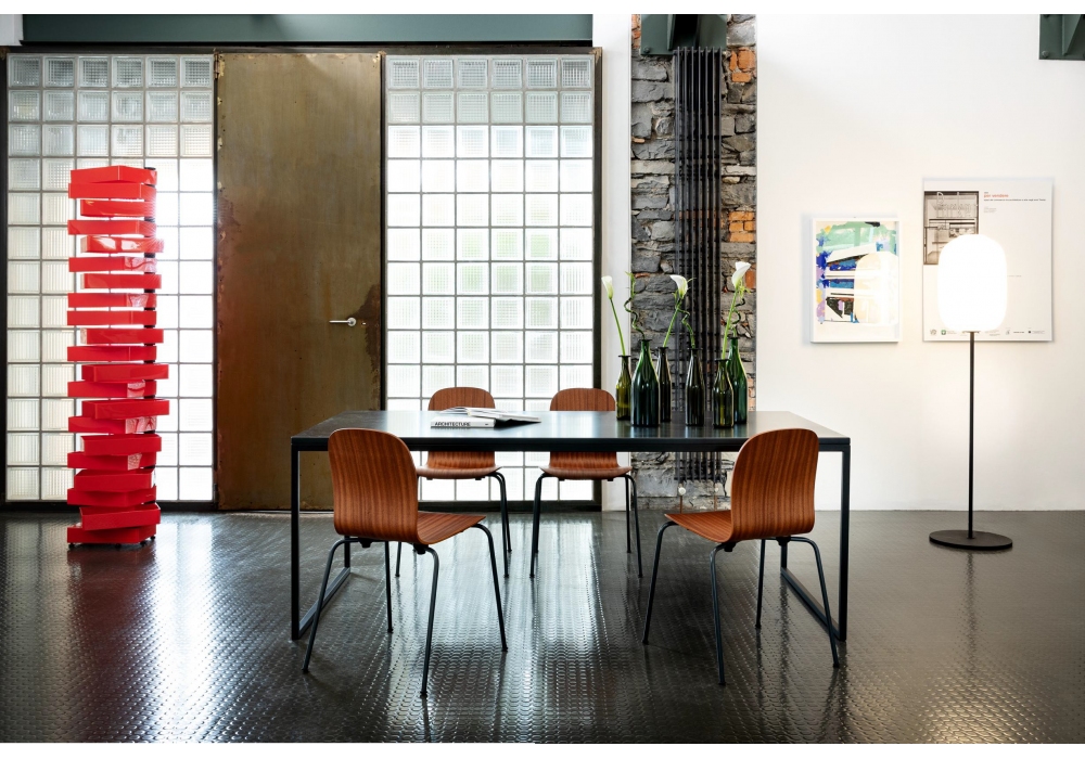 Tate Wood diseñada por Jasper Morrison para Cappellini es una silla apilable con carcasa de contrachapado de haya chapada en roble o caoba y base de metal con trineo o 4 patas. Disponible en diferentes acabados.