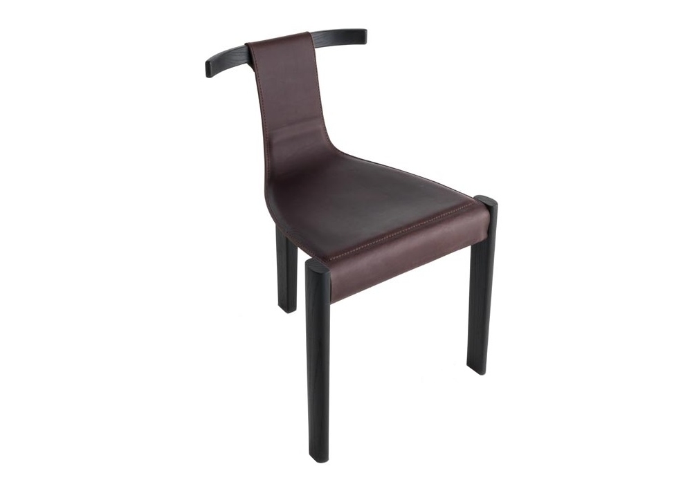 Pablita diseñada por Marcello Pozzi para Casamania & Horm es una silla de tres patas hecha con una estructura de soporte y respaldo en fresno negro macizo. Elemento de conexión entre las patas en acero inoxidable y fibra de carbono. El asiento suspendido está fabricado con un núcleo de metal completamente tapizado en cuero.