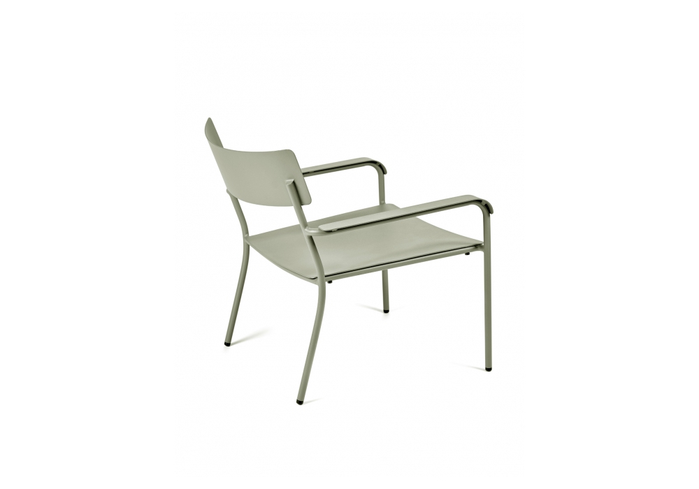 August diseñada por Vincent Van Duysen para Serax es una silla baja con reposabrazos, concebida internamente en aluminio pintado en polvo en tres acabados diferentes; negro, verde eucalipto o arena. El respaldo y el asiento son ligeramente más anchos que un asiento clásico para garantizar una comodidad óptima y se pueden utilizar tanto como silla para interiores como para exteriores.
