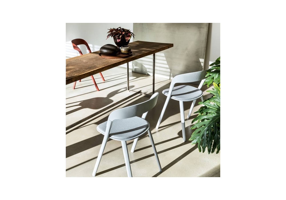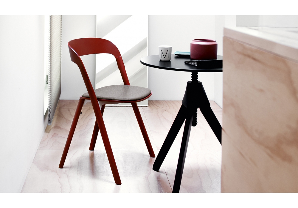 Pila diseñada por Ronan & Erwan Bouroullec para Magis es una silla con asiento y respaldo en multicapa de fresno y patas en madera maciza natural o pintada. Elementos de unión en aluminio inyectado arenado o pintado con resina epoxi (para la estructura de fresno negro). Asiento acolchado y tapizado en tela en varios acabados.