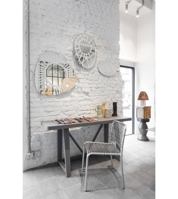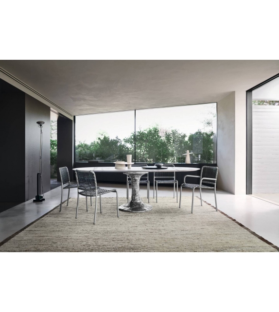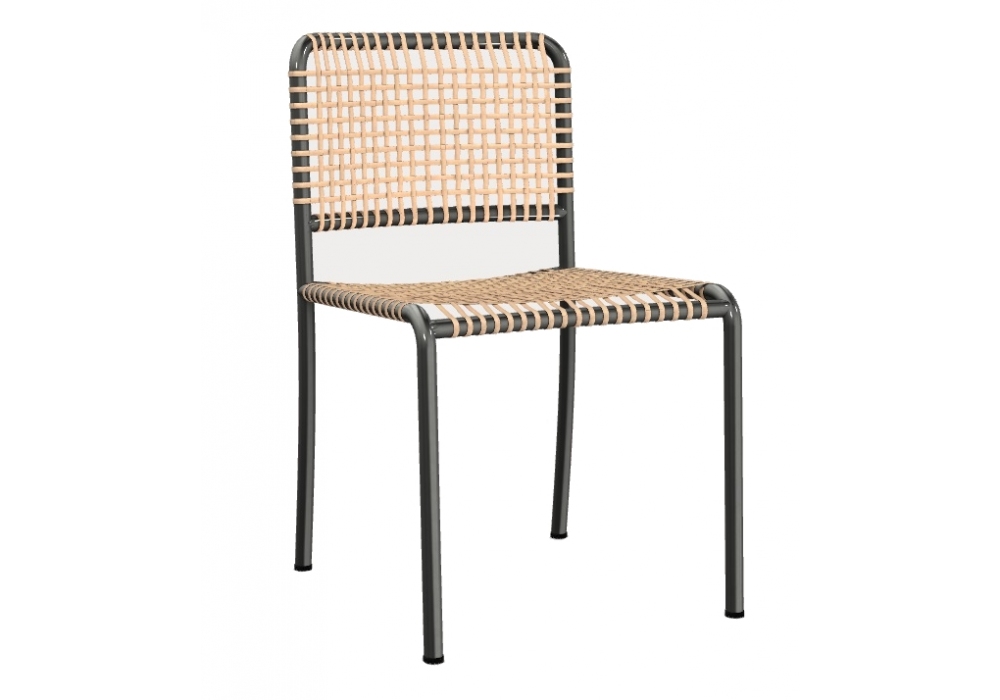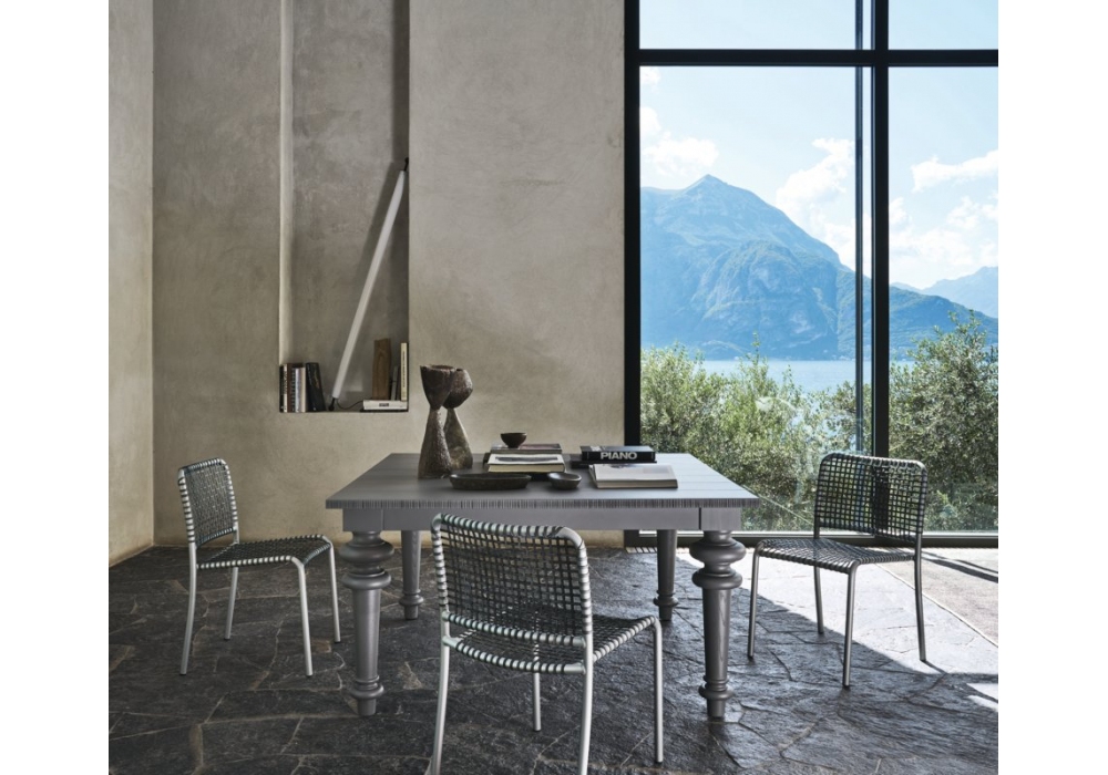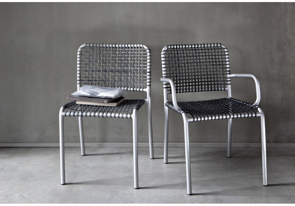 Allu diseñada por Paola Navone para Gervasoni es una silla apilable en tubular de aluminio anodizado, tejido con cuero natural o gris.