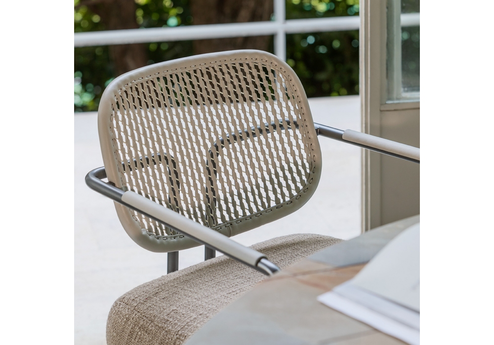 Arno diseñado por Matteo Nunziati para Natevo es un pequeño sillón con estructura de metal bruñido mate, respaldo revestido en cuero trenzado, asiento tapizado con revestimiento en tela o cuero. Detalles de los reposabrazos en piel del mismo color que el respaldo.