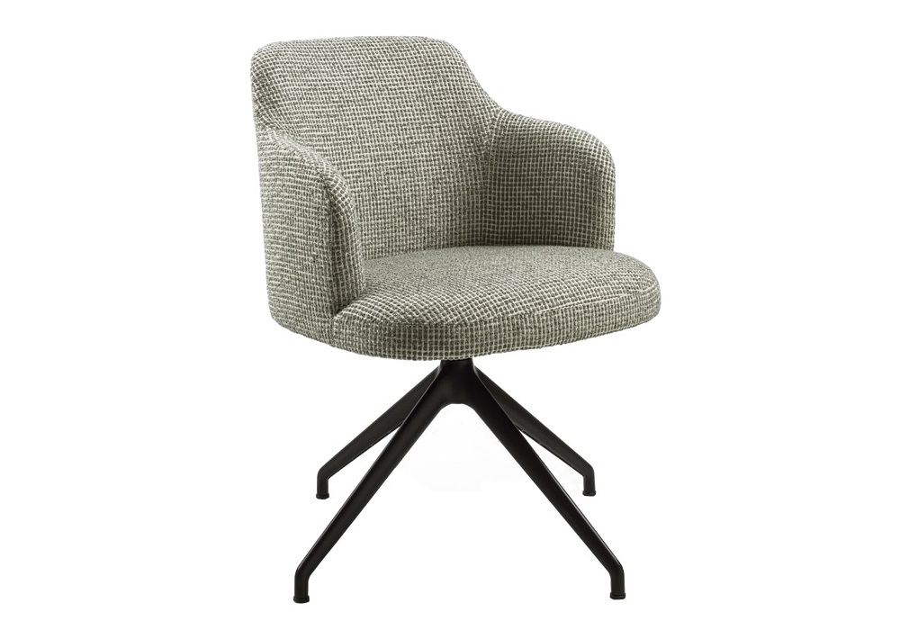 Abby diseñada por Gabriele & Oscar Buratti para Porada es una silla giratoria con reposabrazos realizada con base de metal de cuatro radios y revestimiento en tela.