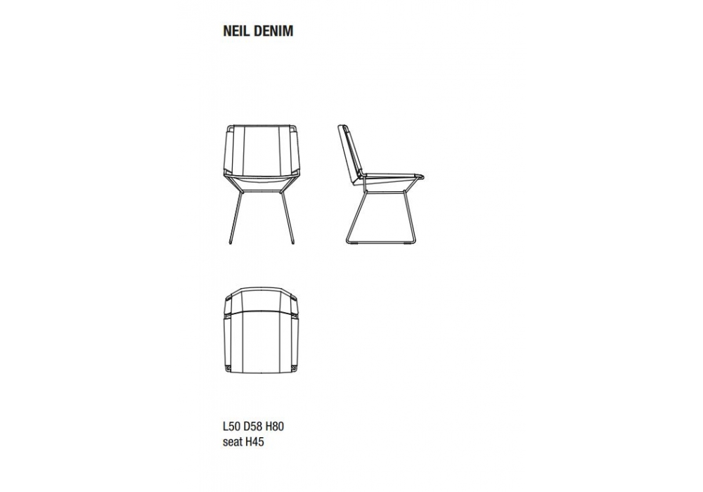 Neil Denim diseñada por Jean Marie Massaud para MDF Italia, en colaboración con la alta sastrería de Jacob Cohën, es una silla con respaldo y asiento en acabado denim. El tejido se caracteriza por costuras remachadas y costuras estéticas en contraste de color tabaco, inspiradas en el empaque de los jeans clásicos. La estructura portante del respaldo y del asiento está realizada en alambre de acero, disponible en diferentes acabados.
