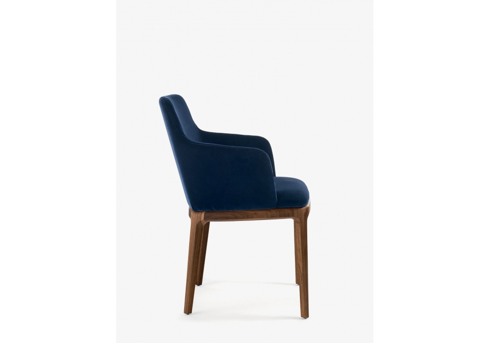 Cloe Arm diseñada por C.R. & S. Riva 1920 es una silla con patas de madera maciza y carcasa de espuma de poliuretano en continuidad con asiento y respaldo. Revestimiento en piel o tela, respaldo con pespuntes de rombos o liso.