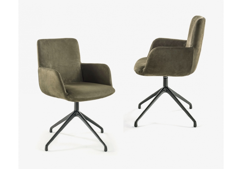 Materia Soft Arm diseñada por Claudio Bellini para Riva 1920 es una silla con carcasa envolvente realizada en poliuretano con respaldo y asiento tapizado en piel o tejido con costuras vistas. Equipado con una base giratoria de hierro.