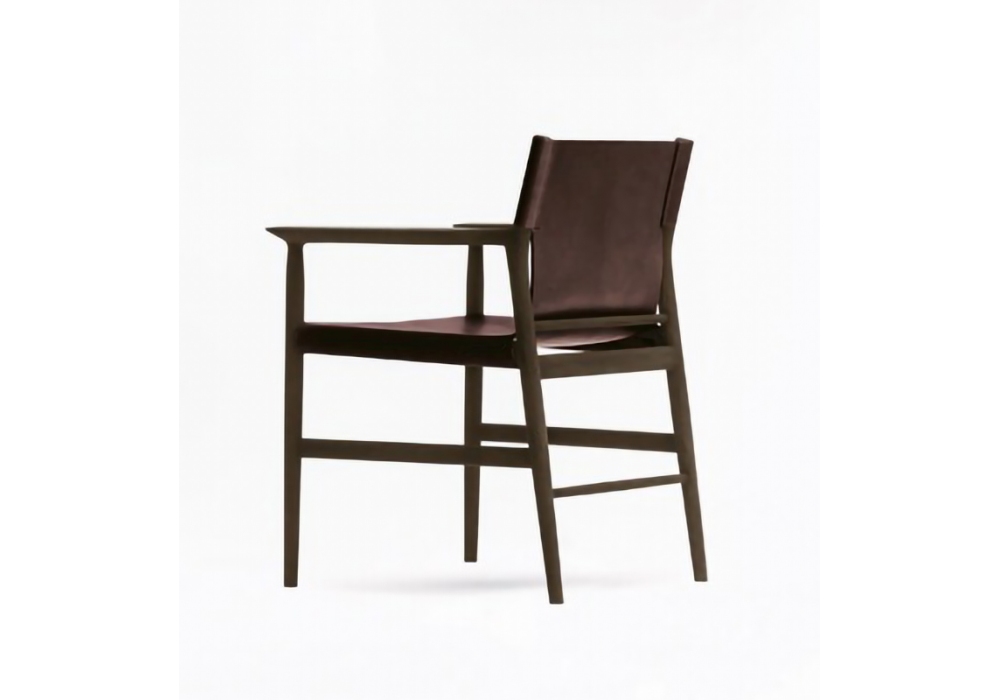 Sunset diseñada por Time & Style ēdition para DePadova es una silla con estructura en roble macizo teñido blanco nieve o gris antracita, asiento y respaldo en piel camel o marrón oscuro.