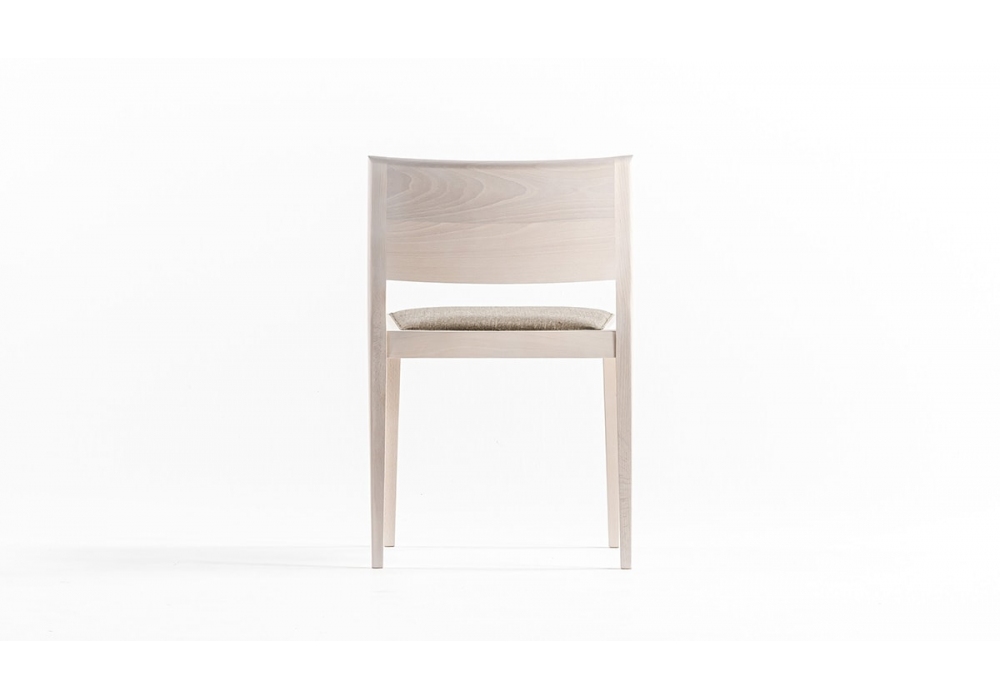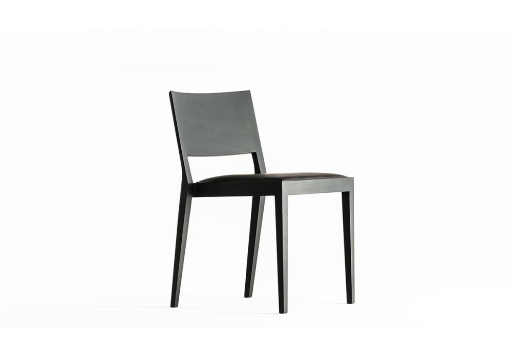 A Chair in the Forest diseñada por Time & Style ēdition para DePadova es una silla con estructura en haya maciza teñida blanco nieve o gris antracita, asiento acolchado y revestimiento fijo en tejido gris o piel marrón oscuro.