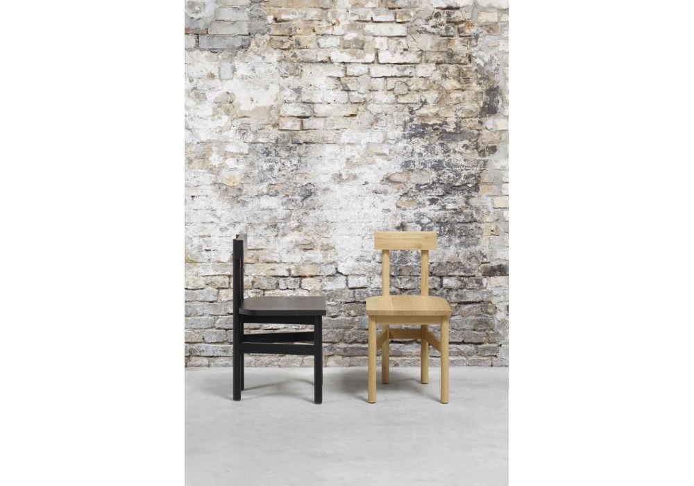 Gamar diseñada por Spacon & X para E15 es una silla con estructura de madera, está realizada en roble europeo transparente o lacado en negro.