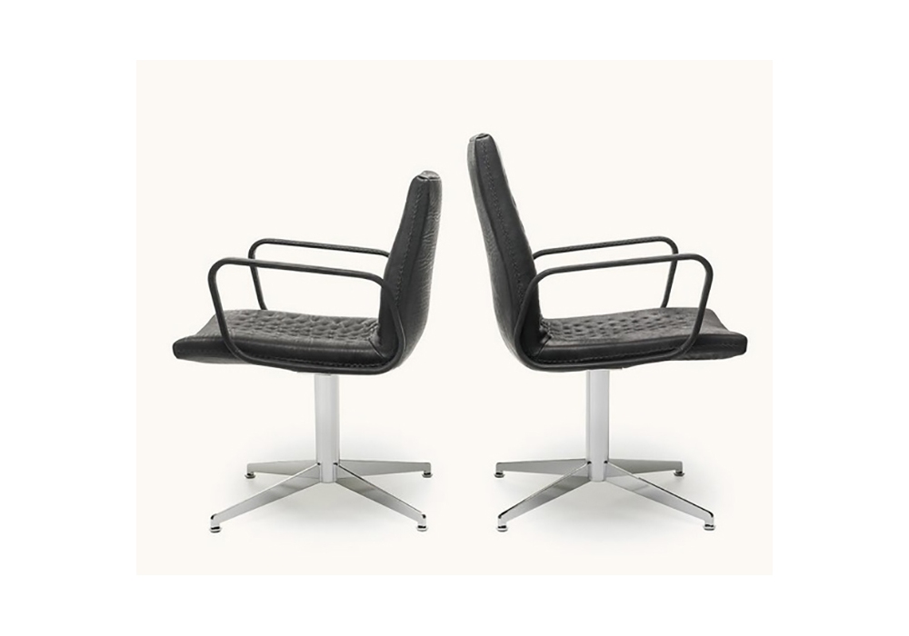 DS-1051 diseñada por de Sede Design Team para De Sede es una silla con estructura de cinco puntos en cromo pulido, tapizado en dacron con costuras fijas y punto de cruz tono sobre tono. Disponible en la versión con o sin reposabrazos y en diferentes acabados.