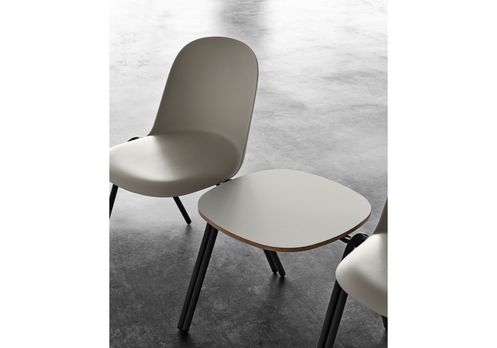 Mariolina Edu diseñada por E-ggs para Miniforms es una silla con carcasa en polipropileno y base enganchable en varilla pintada antracita o galvanizada. Disponible en diferentes acabados.